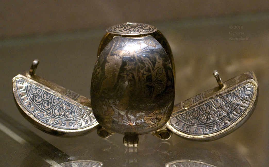 reliquary apple, 14th c. France, silver, niello, and gilt, Louvre OA 6712. For details see Louvre.