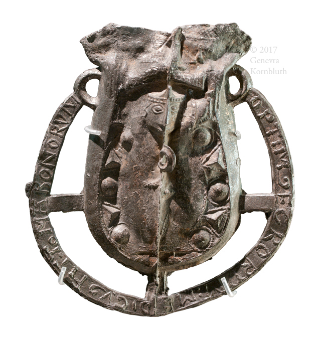 St. Leonard blessing a prisoner, manacles on wall, 13th-14th c., from Saint-Leonard-de-Noblat, France, lead alloy, MoL 82.8/13