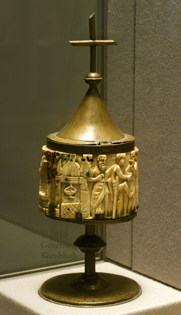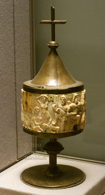 copper mount France 15th c., holding pyxis 1 from Lavoûte-Chilhac: Christ and the Samaritan woman at the well, ivory, eastern Mediterranean? c.550-600; Louvre OA 5524 A