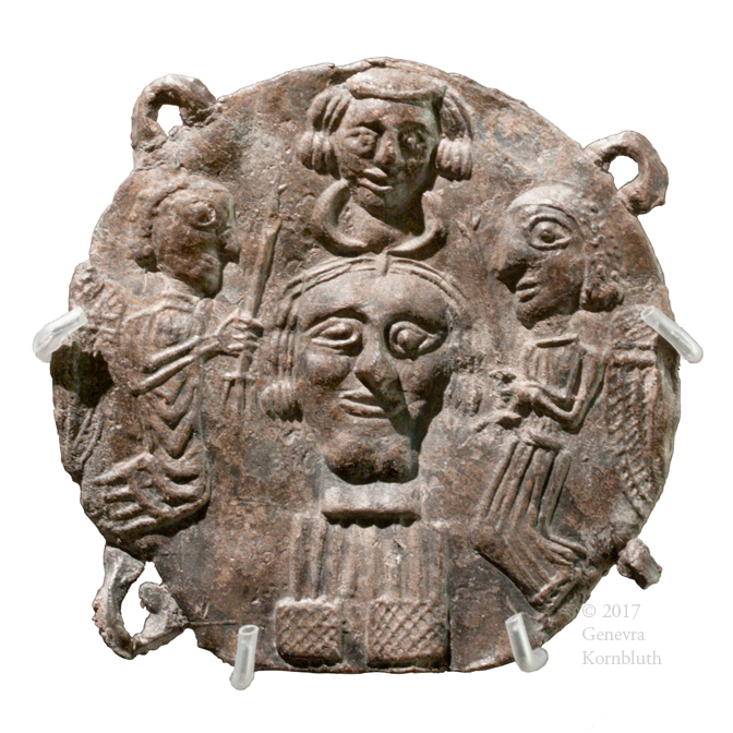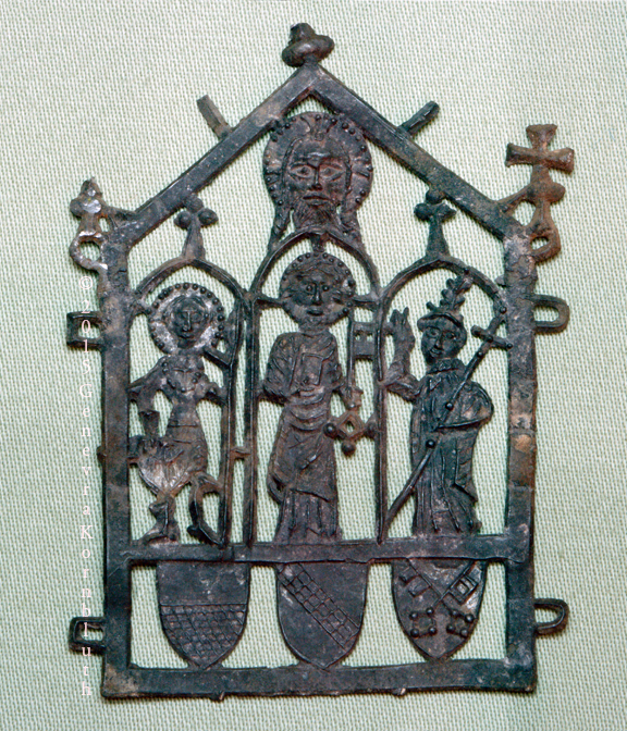 Christ; St. Maurice, St. Peter, Pope Boniface IX: tin pilgrim sign, Magdeburg c.1450, WienMus
