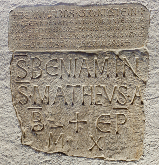 record of 1908 discovery (top), Bernward foundation stone 1010, St. Michael's, Hildesheim, which has its own pages