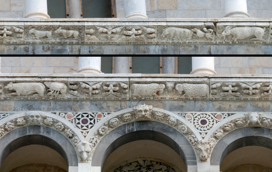 wolf center left, hunting frieze: west façade completed by 1180, Pisa cathedral, which has its own pages