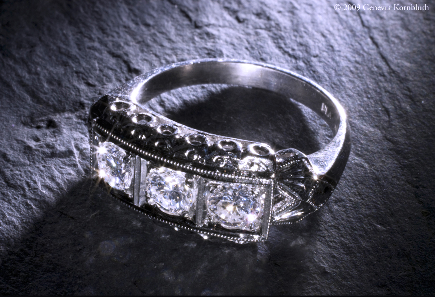 Diamond and platinum ring, probably early twentieth century. Images to the left and below demonstrate the effects of light directed through the three large diamonds from the back, and reflected off the facets of the stones and the angles of the metalwork mount. Private collection.