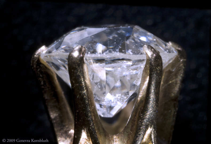 Diamond and gold earrings with screw back, probably early twentieth century. The detail below documents the color of the brilliant-cut diamond, the angles and proportions of its crown and pavillion facets, and the abrasion on its girdle. Private collection.