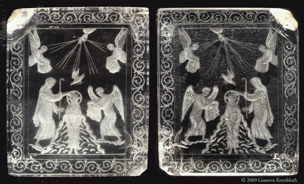 Rock crystal intaglio: Baptism of Christ. Carolingian, c.855-869. Details below document the engraving on the reverse viewed directly and from the obverse, through the stone; the marks cut by a rounded drill; and the artist's preliminary sketching with a hardstone point. Rouen, Musée Départemental des Antiquités.