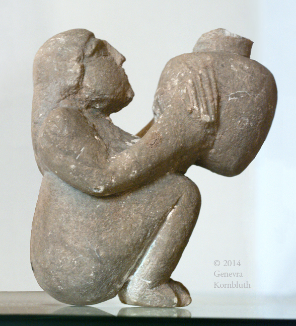 orant holding vase, alabaster, late Uruk c.3300 BCE, Louvre Sb 71. For other views see Louvre.