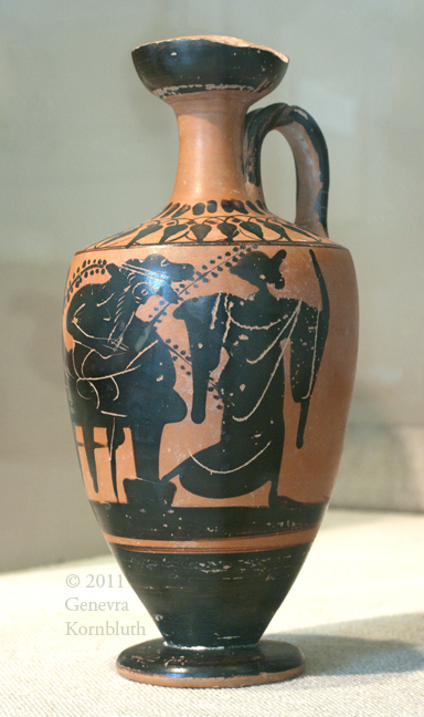 black-figure Attic lekythos: Hercules and dancers at a banquet, or Dionysos with maenads, end of 6th c. BCE, KM 0000.00.2596. For another view see Kelsey.