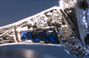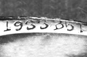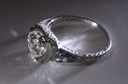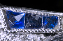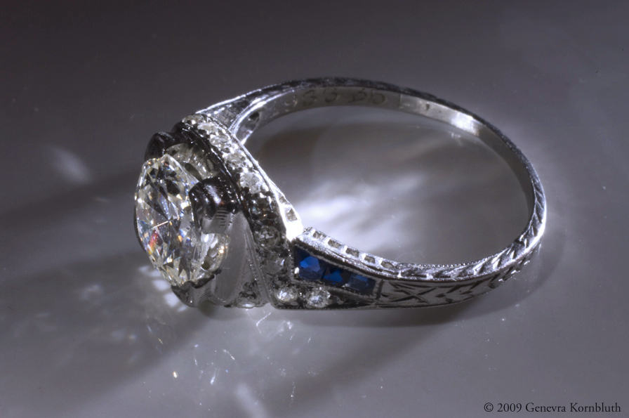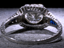 Platinum, diamond, and sapphire ring, dated 1933. The additional views below document its inscription, the unusual trapezoidal cut and chipping of its sapphires, and the clarity of its central diamond (seen from behind).