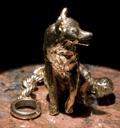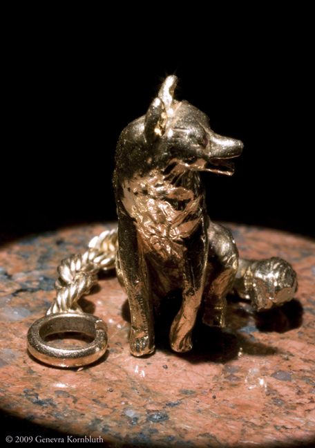 Gold watch fob in the shape of a fox, probably late 19th century. Details below document the attachment of the chain (with an end loop) that linked the fob to a pocket watch, the damage to the fox's side along with the loop that probably caused it, the multiple interlocking links of the chain, and the small fox posed on an American quarter. Private collection.
