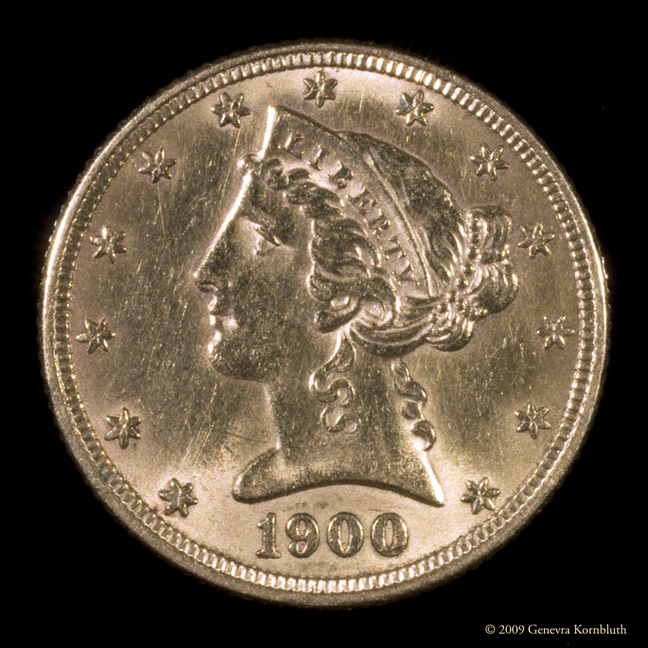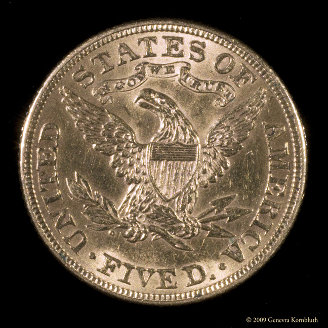 It is sometimes the smallest details that give an object value. As you see on this American gold half eagle, I can document microscopic features. This detail shows the background striations on the reverse, caused by tooling on the original die. It also shows the precise condition of the coin. (Private collection)