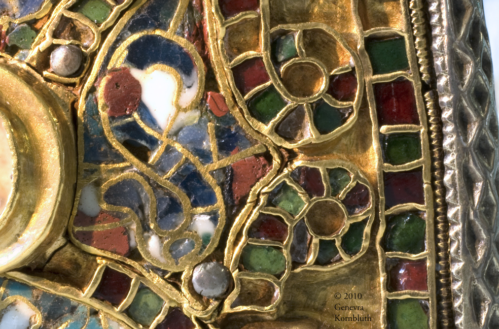 On this eighth-century reliquary, for example, I document the use of both enamel (on the left of the detail photo) and garnet and cut glass inlay (on the right of the same photo).